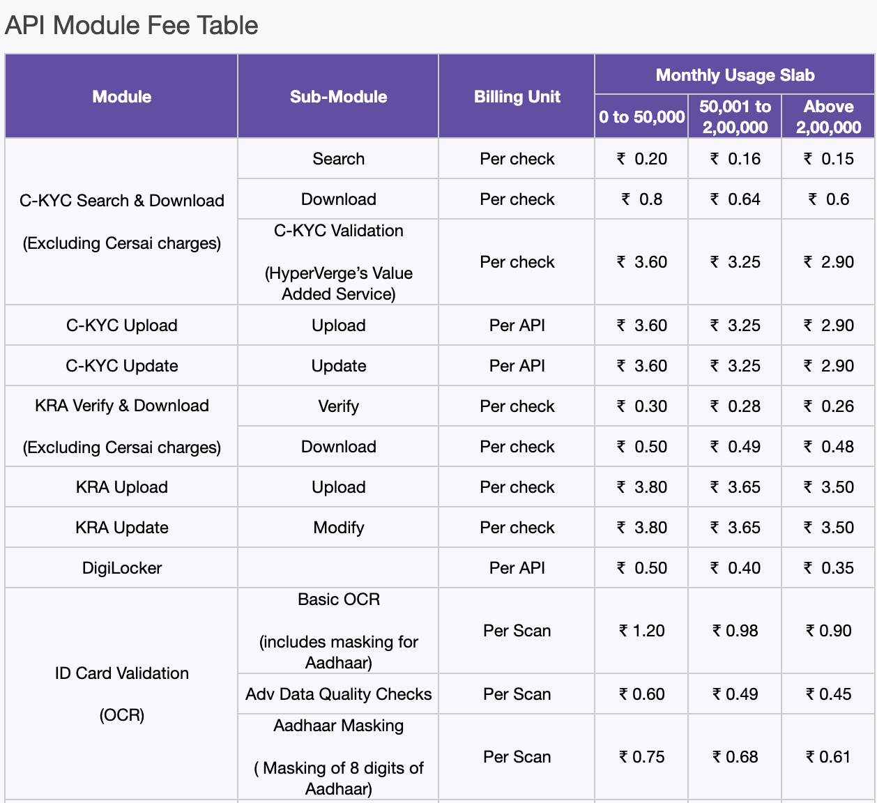 | ID Card Validation | OCR | 1,001–5,000 | Rs. 2 |